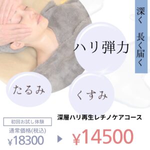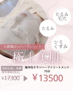 小顔矯正→油溶性ピュアレチノール導入→セラミドシーリングマスク→ヘッドマッサージ→鎮静海藻パック→ハンドマッサージ→整肌