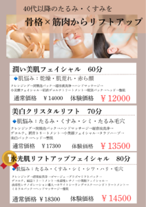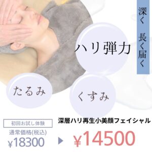 小美顔フェイシャル→油溶性ピュアレチノールポレーシヨンポレーション導入→セラミドシーリングマスク→ヘッドマッサージ→海藻生パック→ハンドマッサージ→整肌